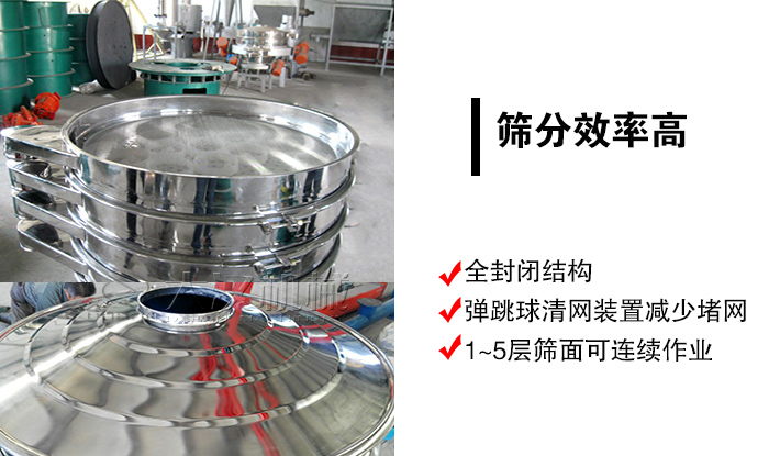 旋振篩采用全封閉結(jié)構(gòu),可保證中西藥顆粒篩分過程中無粉塵溢散等情況發(fā)生,另外,旋振篩篩網(wǎng)下裝有彈跳球,可以對篩網(wǎng)進行清潔,有效解決篩網(wǎng)堵孔,進而提高了篩分效率,1~5層篩面,雜質(zhì)或粗料會自動排出,可連續(xù)作業(yè),篩分更高效。