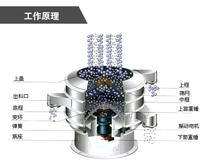 圓形旋振篩主要由進料口、防塵蓋、出料口、束環(huán)、篩網、配重塊、上部重錘、振動體、振動電機、彈簧、下部重錘、機座等部分組成。