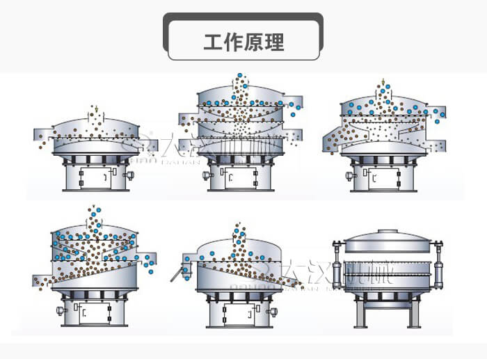 它是以直立式電機(jī)作激振源,通過(guò)調(diào)節(jié)電機(jī)上、下兩端安裝有偏心重錘,可將電機(jī)的旋轉(zhuǎn)運(yùn)動(dòng)轉(zhuǎn)變?yōu)樗健⒋怪?、傾斜的三次元運(yùn)動(dòng),然后再把這個(gè)運(yùn)動(dòng)傳遞給篩面,使篩面上的物料做外擴(kuò)漸開線運(yùn)動(dòng),從而實(shí)現(xiàn)對(duì)粉狀物料進(jìn)行精篩分、概率篩分等。