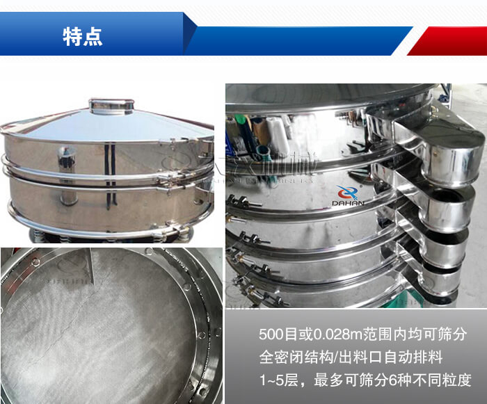 3、采用全密閉結構,防止粉塵溢散,液體飛濺,篩分效率高,還有專門的清網裝置,可減少物料在篩分的過程中的堵網現象,進一步提高其篩分效率;