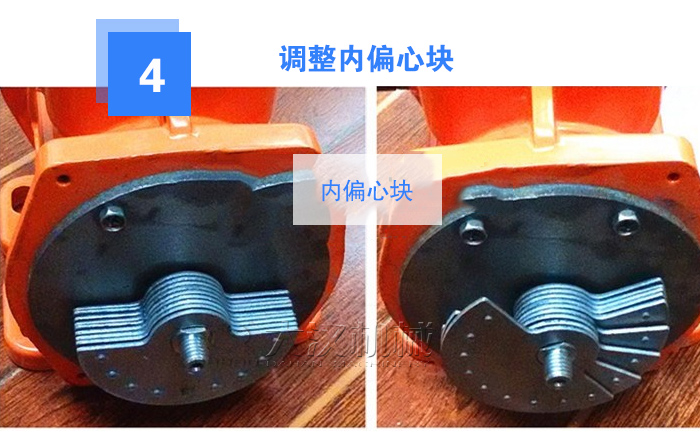 旋松兩側內偏心塊壓緊螺栓,兩側內偏心塊同向轉動,使內偏心塊上的激振力標尺刻線對準外偏心塊上的開縫,調整所需激振力,擰緊內偏心塊壓緊螺栓,裝上防護罩。