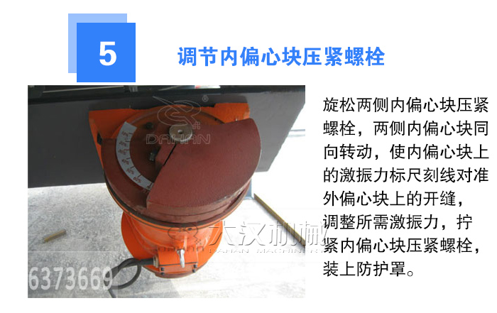 轉軸的兩端面上都刻有基準線,旋松兩側外偏心塊壓緊螺栓,兩側外偏心塊同向轉動,使軸上刻線對準外偏心塊上的激振力標尺刻線,調整所需激振力,擰緊外偏心塊壓緊螺栓,裝上振動電機的防護罩就可以了。