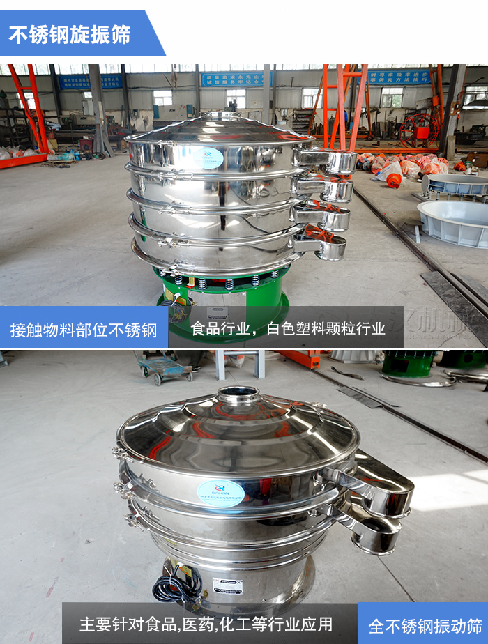 不銹鋼旋振篩的材質樣式分為接觸物料部位為不銹鋼和全不銹鋼振動篩兩種。接觸物料為不銹鋼材質的振動篩主要是物料對接觸的設備材質有所要求,防止物料與碳鋼接觸對物料進行污染,特別是食品行業,白色塑料顆粒行業等。全不銹鋼振動篩是主要針對食品,醫藥,化工等行業應用,其使用環境要求嚴格,容易對設備進行清理。