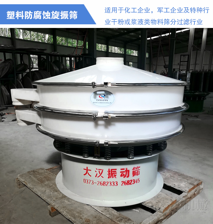 塑料防腐振動篩主要是為了解決篩分時特殊物料與金屬接觸而產生化學反應及腐蝕性較強等問題。振動篩接觸物料部位從篩框、篩網、中框、密封蓋和清網裝置等完全采用非金屬材料,完全排除了一些特殊物料與金屬接觸會產生化學反應等問題。本機適用于化工企業,軍工企業及特種行業干粉或漿液類物料篩分過濾行業。